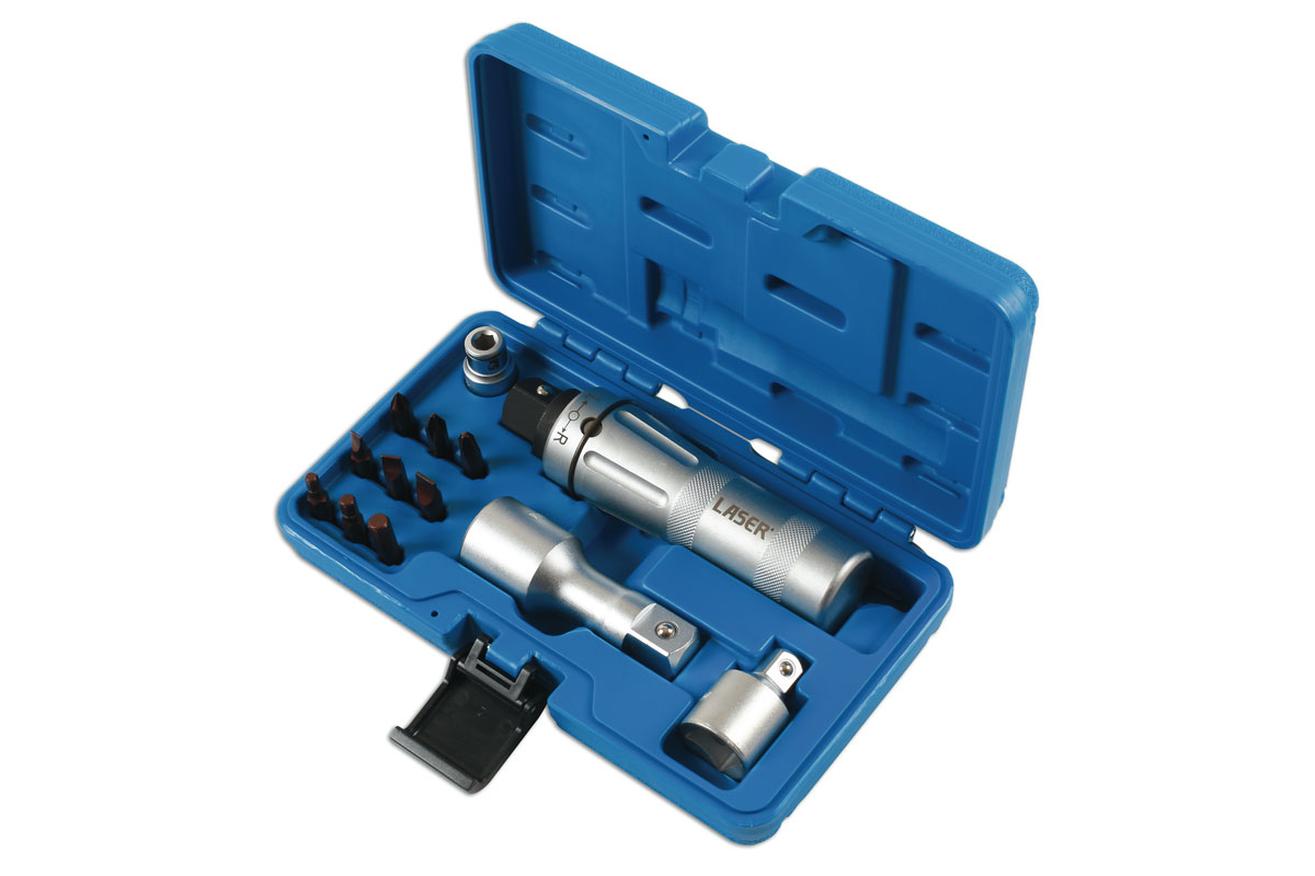 A heavy duty 3/4"D impact driver set with a comprehensive range of accessories including; nine impact bits, bit holder, adaptor and extension bar. The driver delivers a large amount of torque with one hammer blow to release seized or rusted components and it adjusts easily for clockwise and anti-clockwise use. The robust outer sleeve of the driver has finger ridges and a knurled shaft for excellent grip and comes in a durable satin-chrome finish. The kit comes in a blow mold case for convenient storage, ideal for workshop and automotive use.