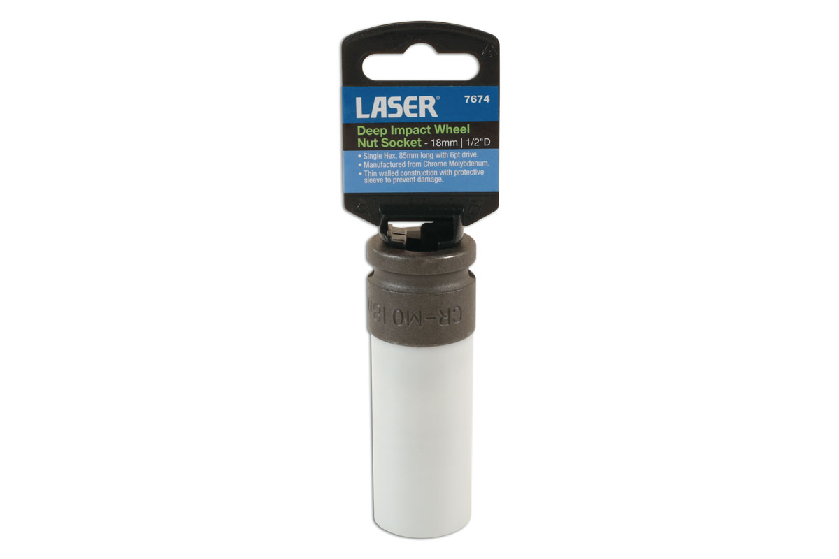 Part of the Laser range of Wheel Nut removal tools. 18mm single hex, deep wheel nut socket, with thin wall design and plastic sleeve to prevent damage to alloy wheels.