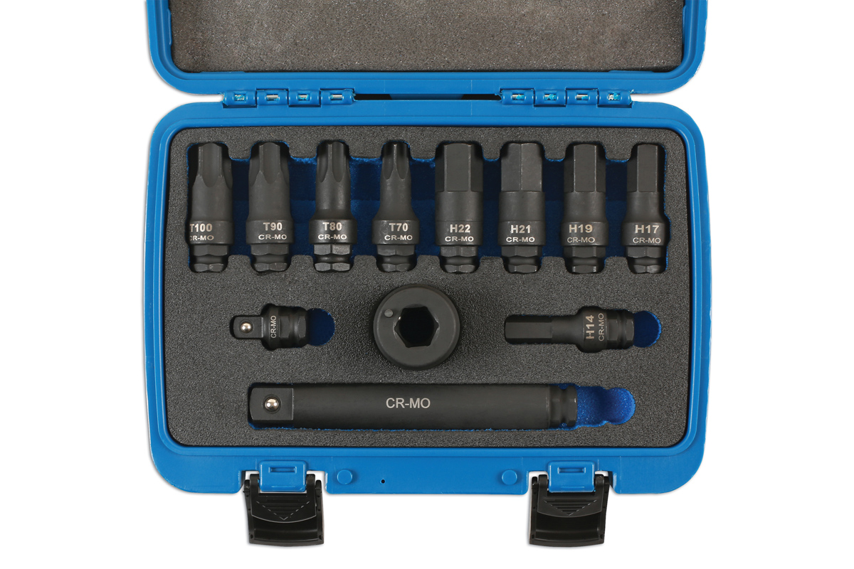 - Inhalt: 9x Bits für 3/4"-Antrieb: Sechskant 14 mm, 17 mm, 19 mm, 21 mm, 22 mm und Sechsrund T70, T80, T90, T100.