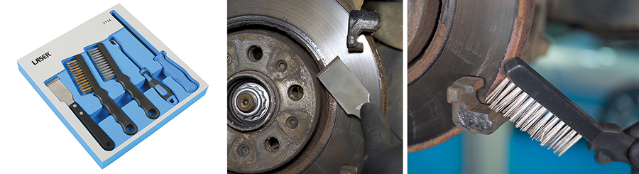 Brake service. It means much more than just fitting a new set of pads. Best practice in the workshop means cleaning corroded discs and removing dirt and debris from the calipers and linkages. That’s why Laser Tools has introduced this new 5-piece brake component cleaning and inspection kit (part number 7714).