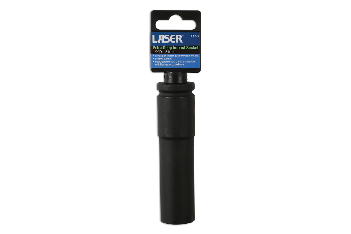 21mm extra deep impact socket, designed for use on air/electric impact guns or impact drivers. Part of a range of extra deep sockets from 10mm to 32mm.
