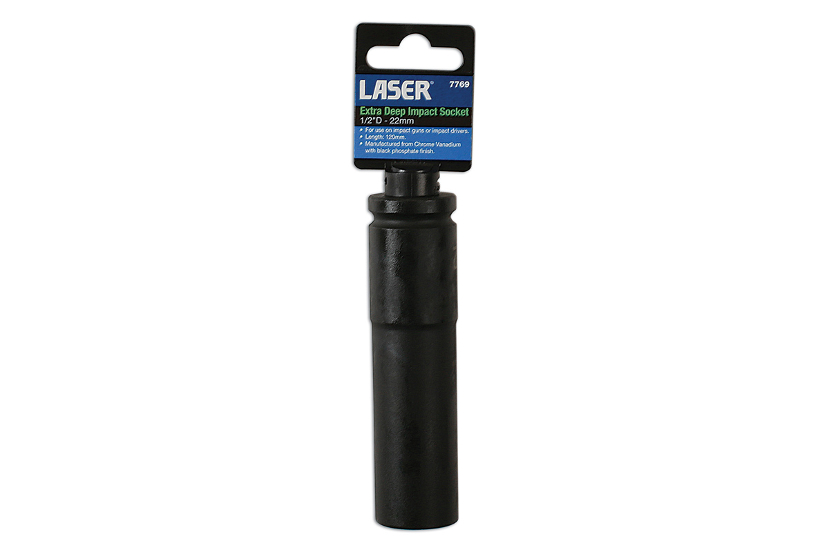 22mm extra deep impact socket, designed for use on air/electric impact guns or impact drivers. Part of a range of extra deep sockets from 10mm to 32mm.
