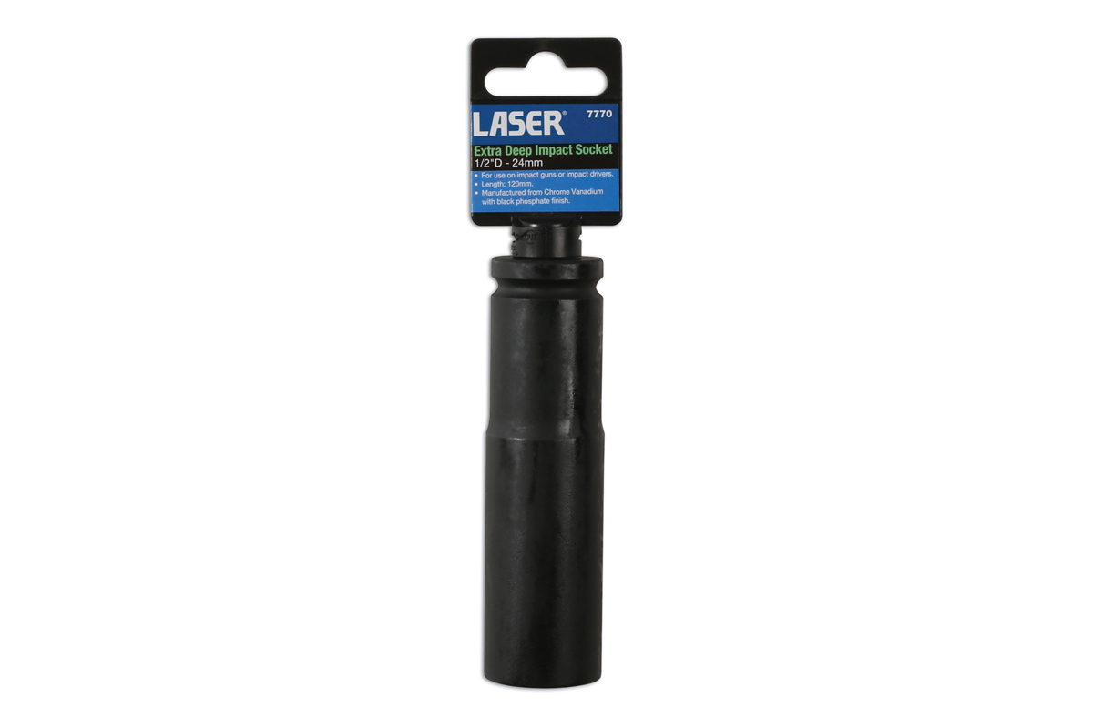 24mm extra deep impact socket, designed for use on air/electric impact guns or impact drivers. Part of a range of extra deep sockets from 10mm to 32mm.