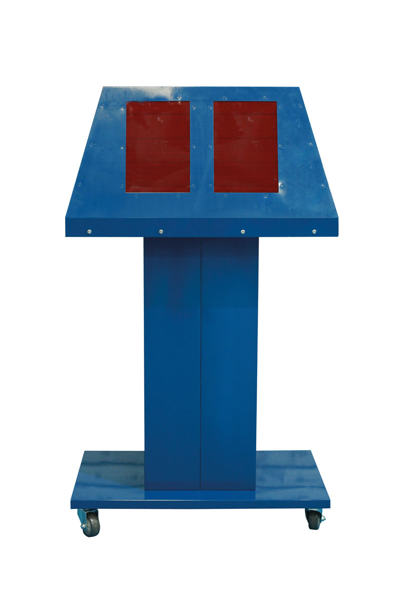 The platform size is 800mm (width) x 400mm (depth) with the flash guard height 390mm. The work surface is a grill which allows dust and particle residue to fall into the removable collection tray for easy disposal. The tinted glass observation panel is to EN25980 certification to protect other workshop users. The booth is equipped with four smooth swivel castors, two fitted with lock brakes to keep the booth steady when in use.