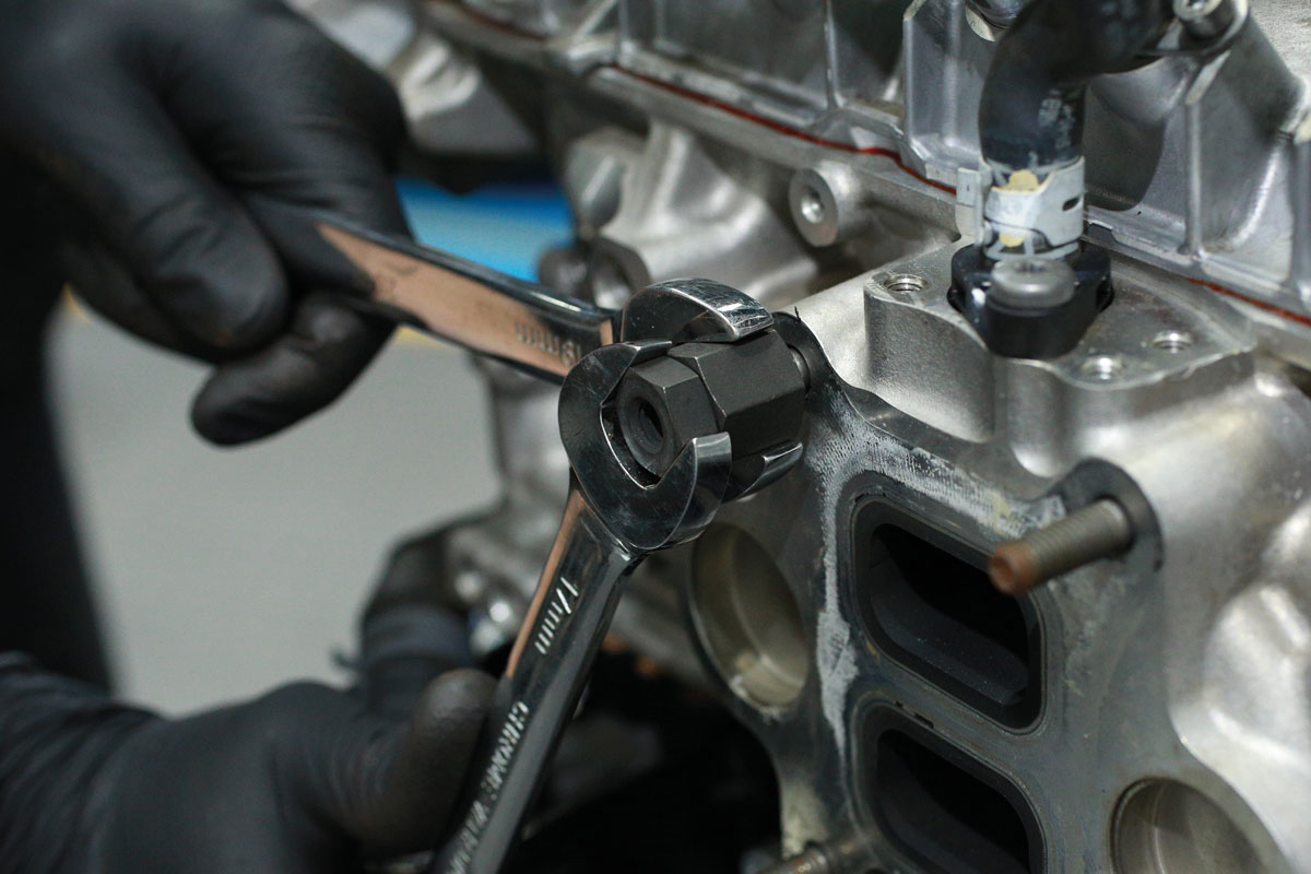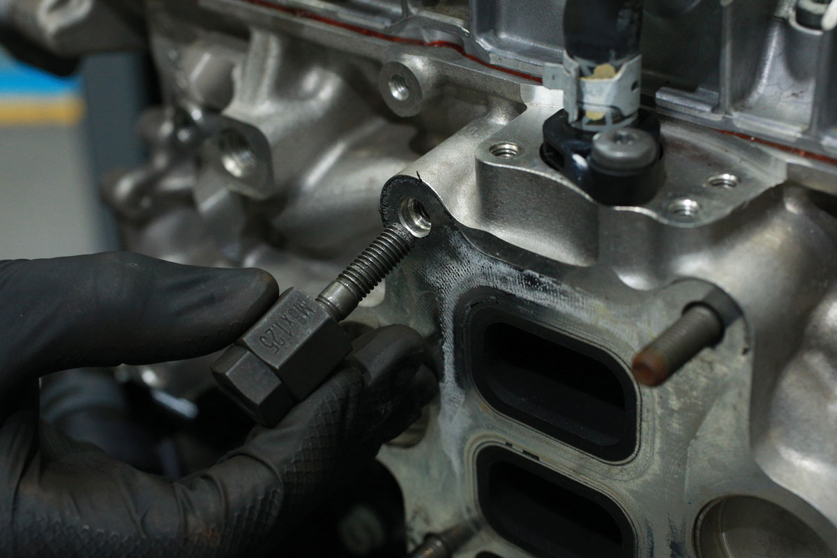 When fitting a new stud it needs to be firmly seated and again, we don't want to compress or otherwise damage the threads. Screw the correctly-sized installer onto the new stud until it reaches the internal ball and won't screw on any further. With the installer now locked firmly onto the stud, screw the stud into the stud hole. Now torque the stud to the manufacturer’s specification. Unlock the installer with the supplied 6mm hex key — the installer can now be easily removed leaving clean, undamaged threads on the stud.