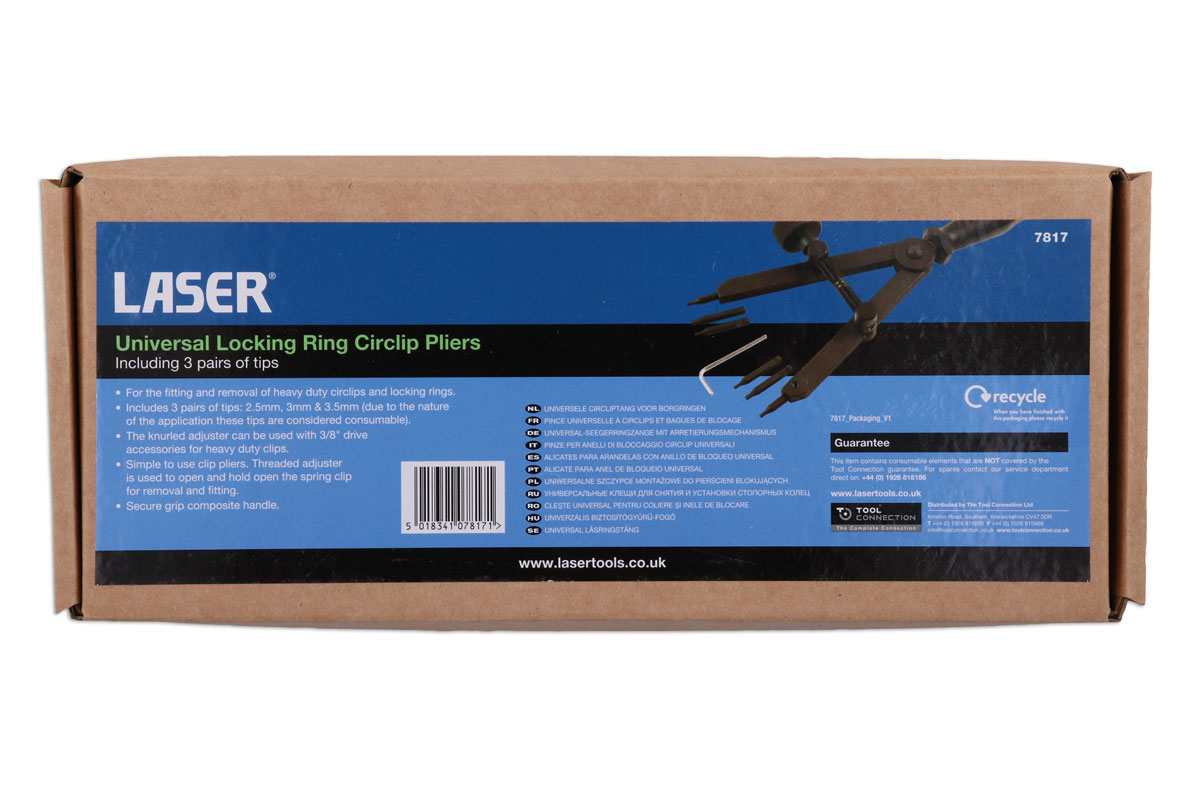 Large, heavy-duty universal locking ring circlip pliers for use with larger internal and external clips and rings. The threaded adjustment mechanism is designed for the effortless fitting and removal of circlips and can also be used with 3/8" drive accessories when extra leverage is necessary. A comprehensive set, including three sets of hardened carbon steel tips 2.5mm, 2.8mm and 3.5mm, designed to fit a wide range of clip sizes.