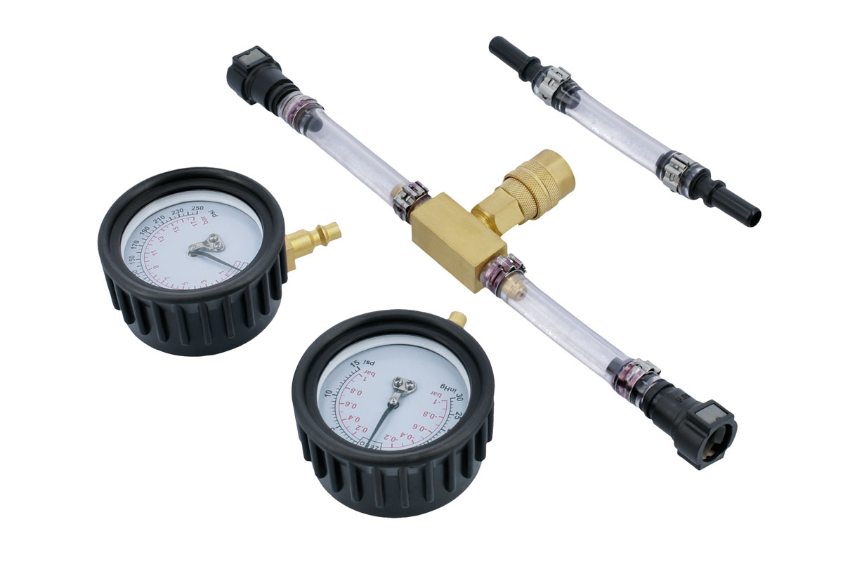 - Diesel fuel low pressure and vacuum test kit with gauge. Fitted with clear pipes to allow easy indentification of air ingress.
