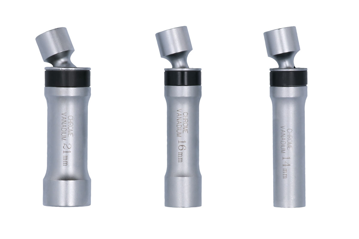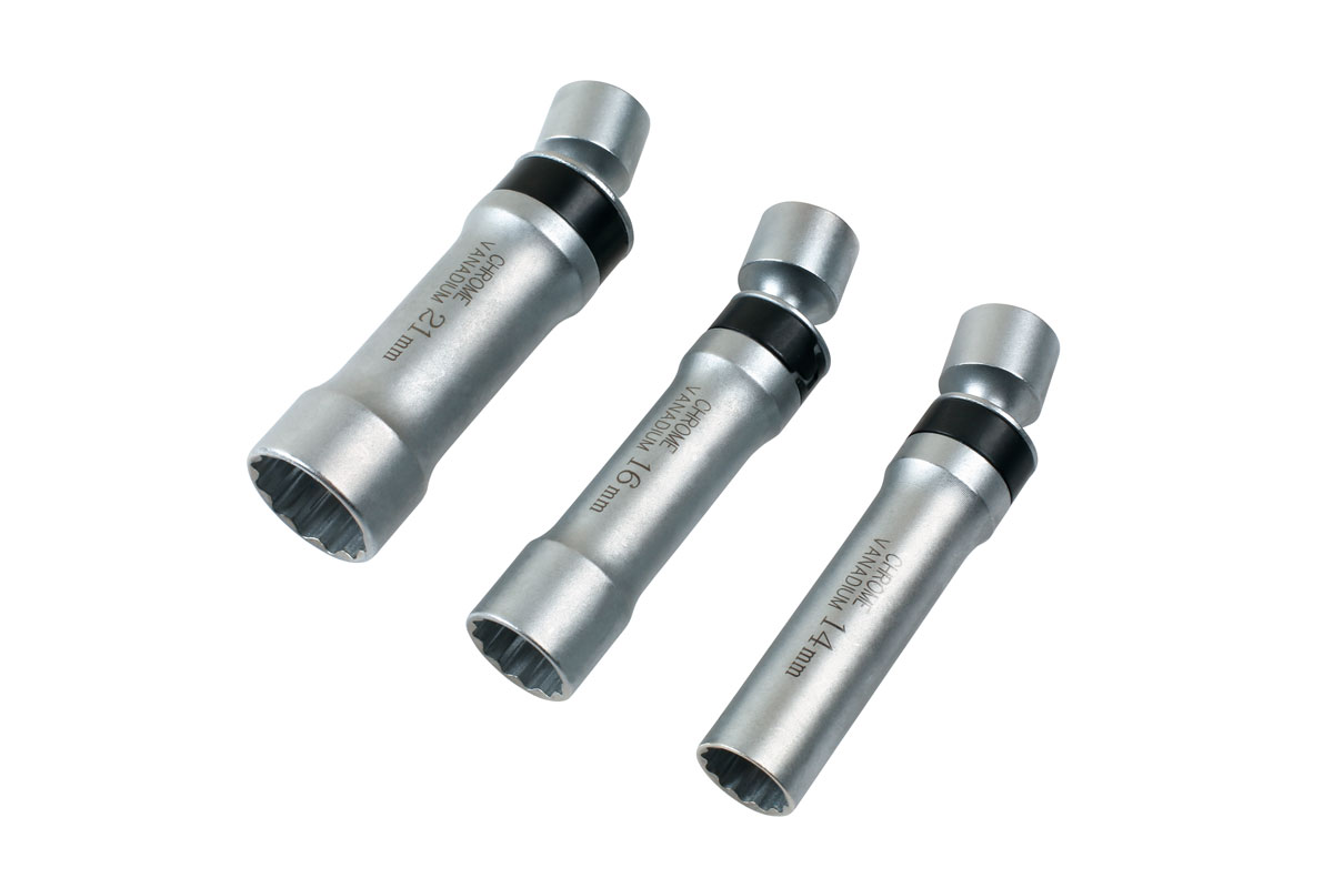 A three piece universal joint, Bi-Hex (12pt) 3/8" drive socket set. The longer length barrel and ball joint head have been designed to access the awkward spark plug recesses commonly found in modern vehicles. This useful set covers all common plug sizes (14mm, 16mm and 21mm). Professional quality sockets with a standard 3/8" drive and rubber inserts for reliable spark plug removal and installation.