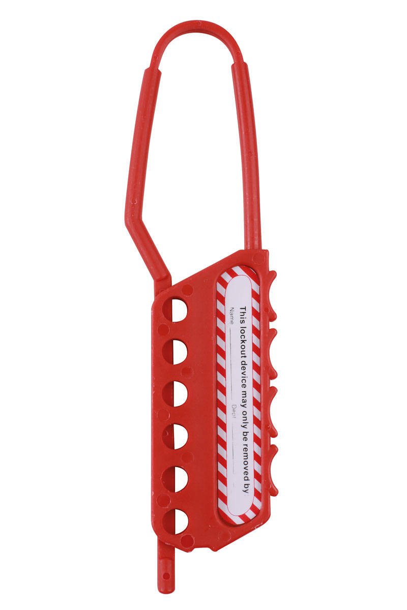 6 holes for multiple padlocks in a flexible hasp. Allows the safe and effective lock out where electric power isolation is required by more than one operative.