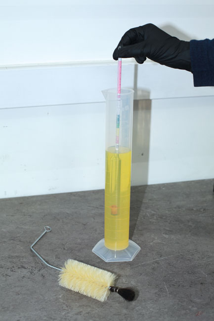 In den letzten Jahren hat die zunehmende Verwendung von Biodiesel und Ethanolbenzin vermehrt zu Motorproblemen geführt. Bestimmte Fahrzeughersteller haben daher die Verwendung dieser Kraftstoffe bei bestimmten Motoren ausdrücklich untersagt, da Probleme auftreten können, wenn die Motoren nicht speziell für diese neuen Kraftstoffe ausgelegt sind. Das Laser Tools Kraftstoff-Identifizierungskit ermöglicht eine schnelle Analyse, ob Biodiesel im Diesel bzw. Ethanol im Benzin vorliegt und in welchem Prozentsatz. Hierzu werden 500 ml des Kraftstoffs aus dem Tank entnommen und das Hydrometer zur Analyse in den Kraftstoff gehalten.
