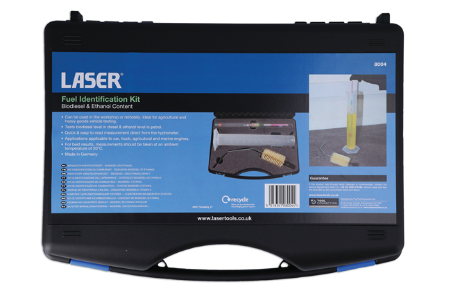 In recent years the increased use of Biodiesel and Ethanol petrols has started to cause running issuess with some diesel and petrol engines. Some vehicles manufacturers have specifically forbidden the use of such fuels on some of their engines because they can cause running problems on engines not designed specifically for them. The Laser Tools Fuel Identification Kit allows the user to quickly identify the presence of and percentage levels of biodiesel in diesel and ethanol in petrol by simply taking a 500ml sample of the fuel from the tank and placing the specially designed hydrometer in the fuel for analysis.