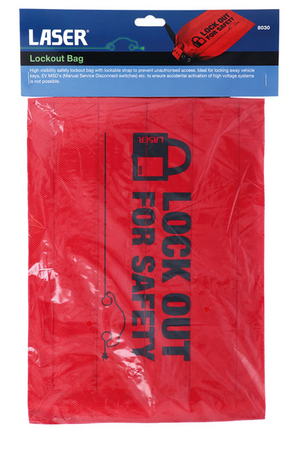 High visibility safety lockout bag with lockable strap to prevent unauthorised access. Ideal for locking away vehicle keys, EV MSD's (Manual Service Disconnect switches) etc. to ensure accidental activation of high voltage systems is not possible.