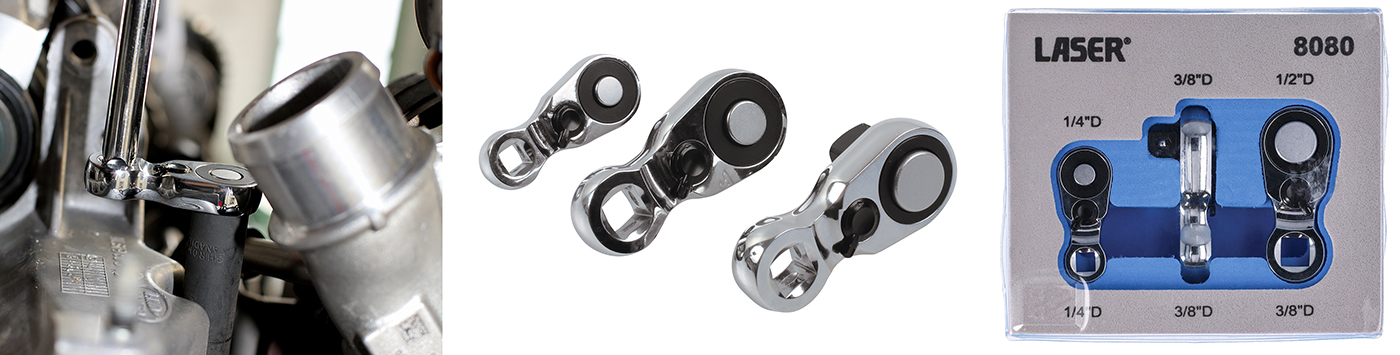 - Tailles plus petites disponibles, voir les références Laser 8077 (carré de 1/4"), 8078 (carré de 3/8"). Le jeu comprend toutes les tailles de cliquet disponibles, voir la référence Laser 8080.