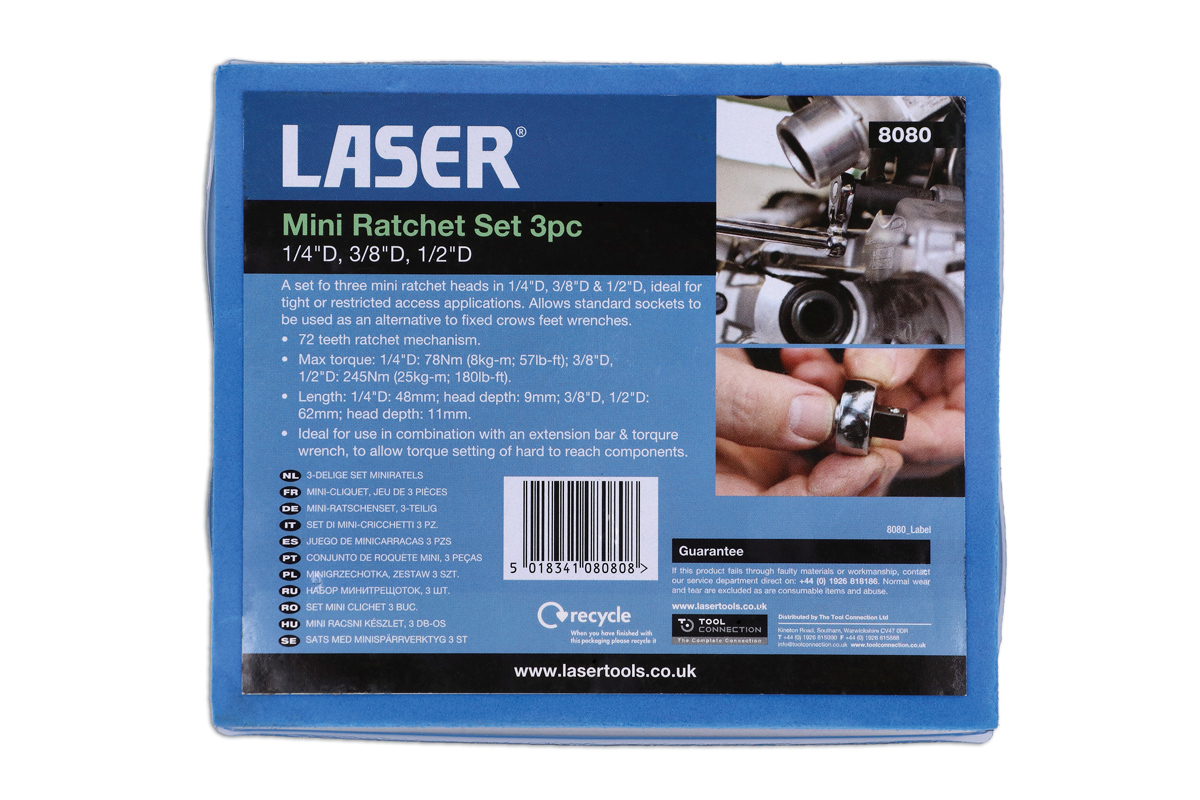 • Ratschen auch einzeln erhältlich, siehe dazu Laser Teile-Nr. 8077 (1/4"-Antrieb), 8078 (3/8"-Antrieb), 8079 (1/2"-Antrieb).