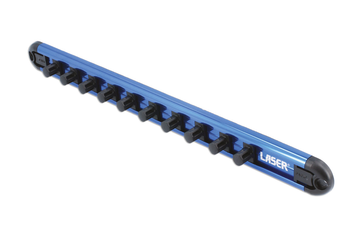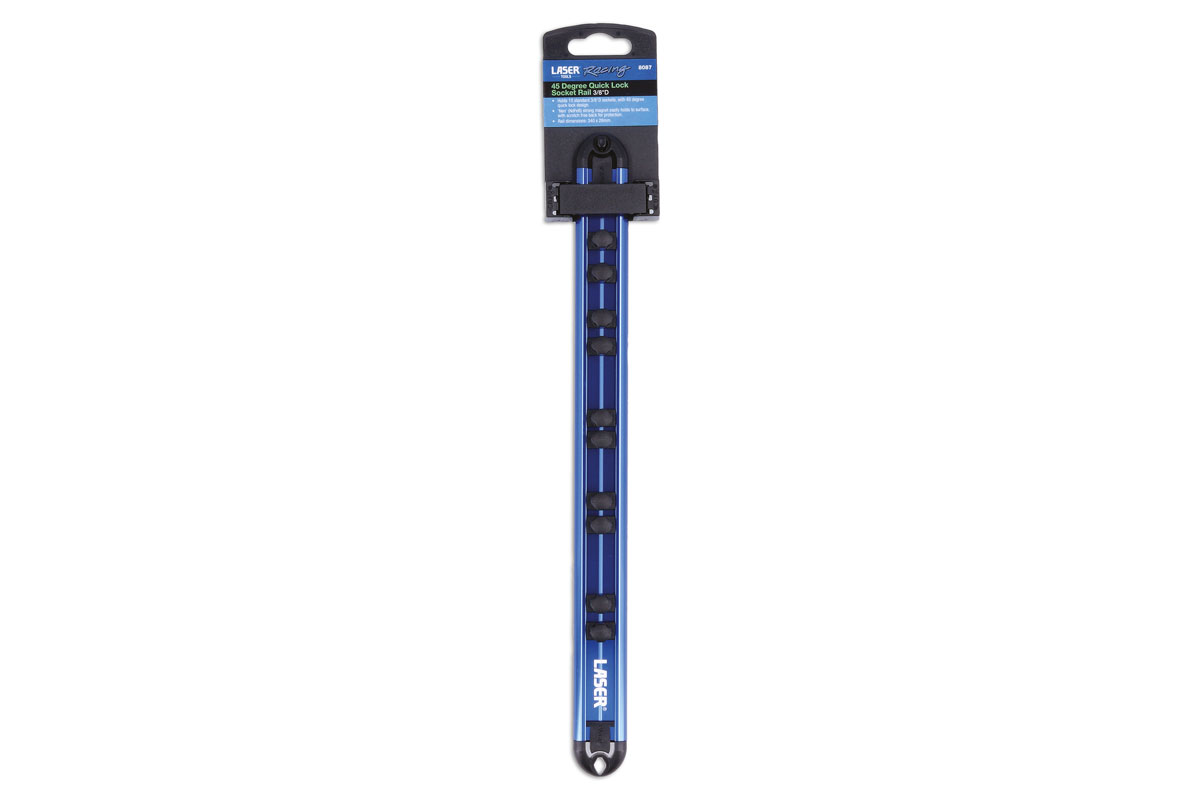 Laser Tools Racing magnetic socket rail, holds ten standard 3/8" drive sockets with 45 degree quick lock mechanism. Powerful rare earth neodymium magnets hold the socket rail securely on any ferrous metal surface and there is a soft, non-scratch backing for protection. The rail is manufactured from lightweight anodized aluminium. A smart, efficient way to keep sockets organized and ready to use.