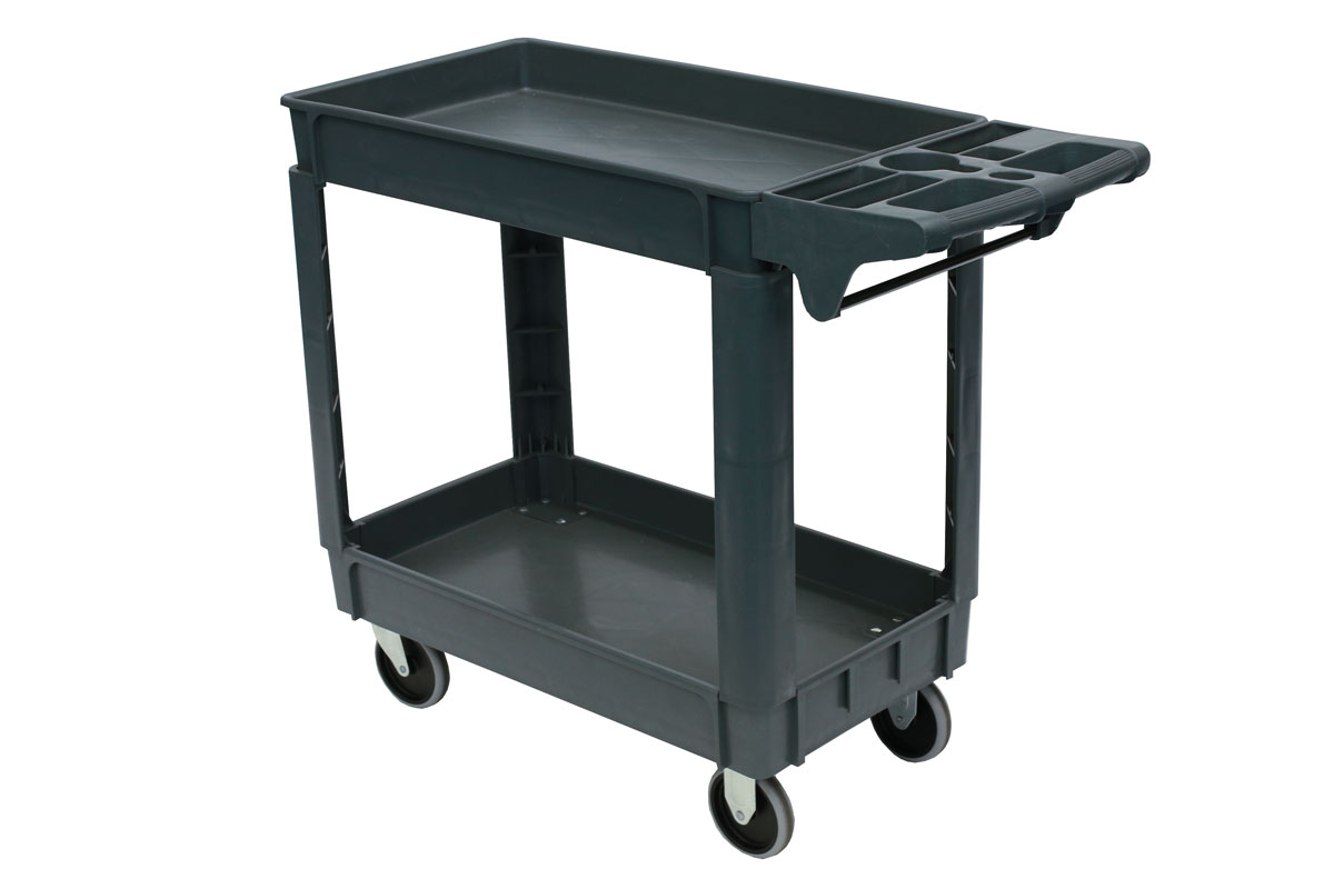 Two level utility cart manufactured from non-conductive, composite material. With a maximum loading capacity of 250kg, supported on castor wheels, this cart is ideal for the easy transportation and storage of tools in a variety of settings including garages and workshops.