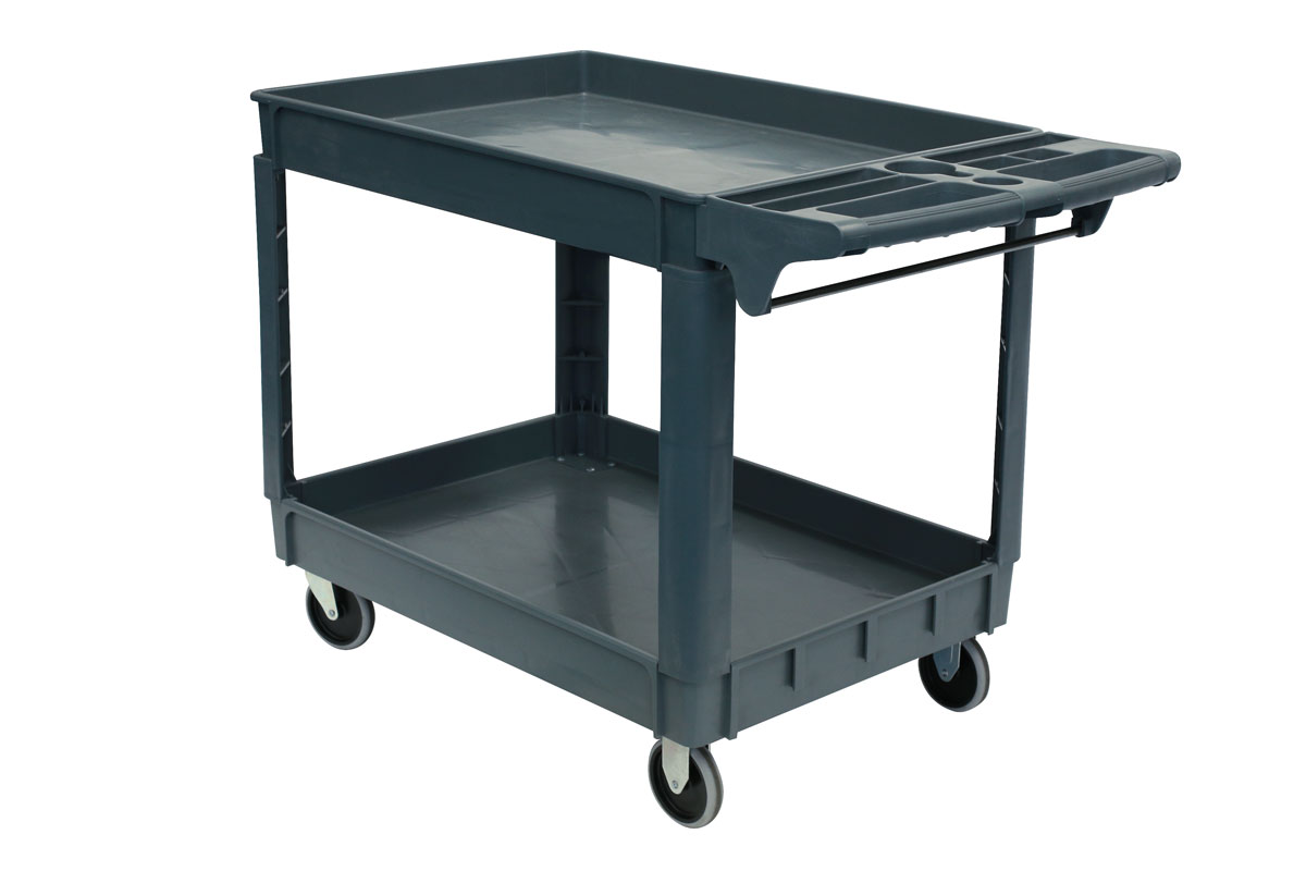 Two level large utility cart manufactured from non-conductive, composite material. With a maximum loading capacity of 250kg, supported on castor wheels, this cart is ideal for the easy transportation and storage of tools in a variety of settings including garages and workshops.