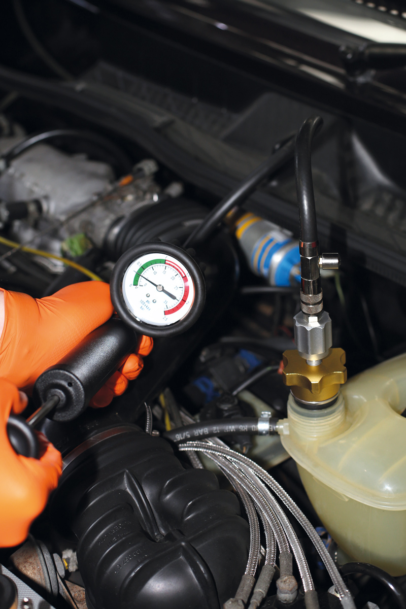 Universal-Druckprüfdeckelset für das Kühlsystem: es wird einfach einer der Gummiadapter über einen dehnbaren Stopfen gestülpt, um die Einfüllstutzen von Kühler und Ausdehnungsgefäß für die Druckprüfung dicht abzuschließen.