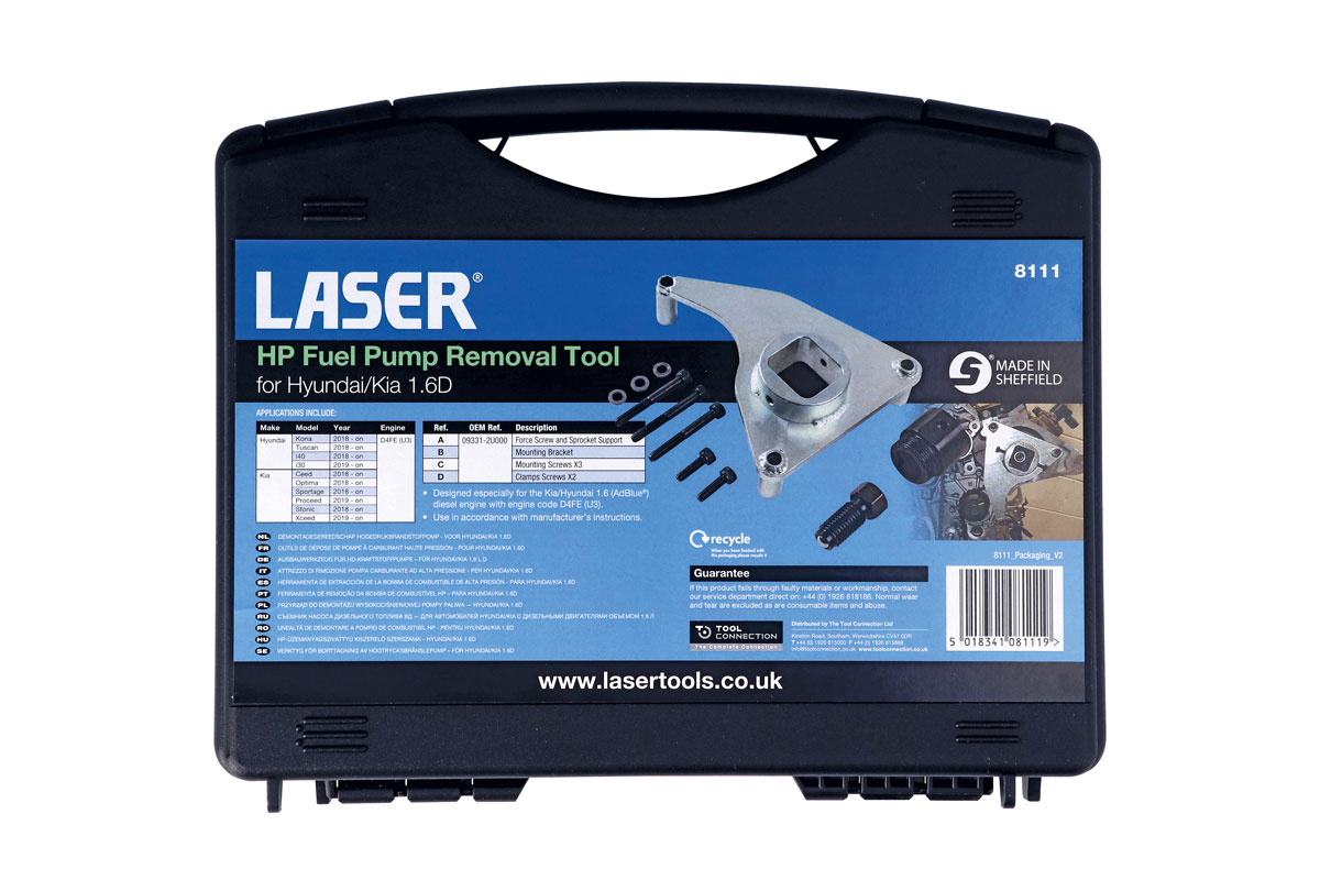 De Laser 8111 is ontwikkeld om het tandwiel van de hogedrukbrandstofpomp veilig te kunnen demonteren uit Hyundai en Kia 1.6 D4FE (U3) dieselmotoren vanaf 2018 en verder. Het maakt het mogelijk de hogedrukbrandstofpomp uit de riemschijf te duwen terwijl de riem op zijn plek wordt gehouden.