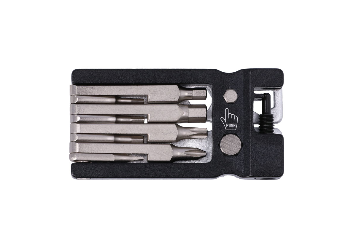Leichtmetall-Multitoolset mit den wichtigsten Werkzeugen für die meisten Reparaturarbeiten unterwegs. Durch sein ultraschlankes Design lässt sich dieses Multitoolset aus Leichtmetall problemlos in Satteltasche, Rucksack oder Jackentasche verstauen.