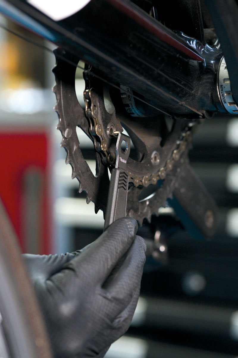 • Besonders flacher Kettenblatt-Maulschlüssel zum Zugriff auf den schmalen Freiraum hinter der Kurbelgarnitur.