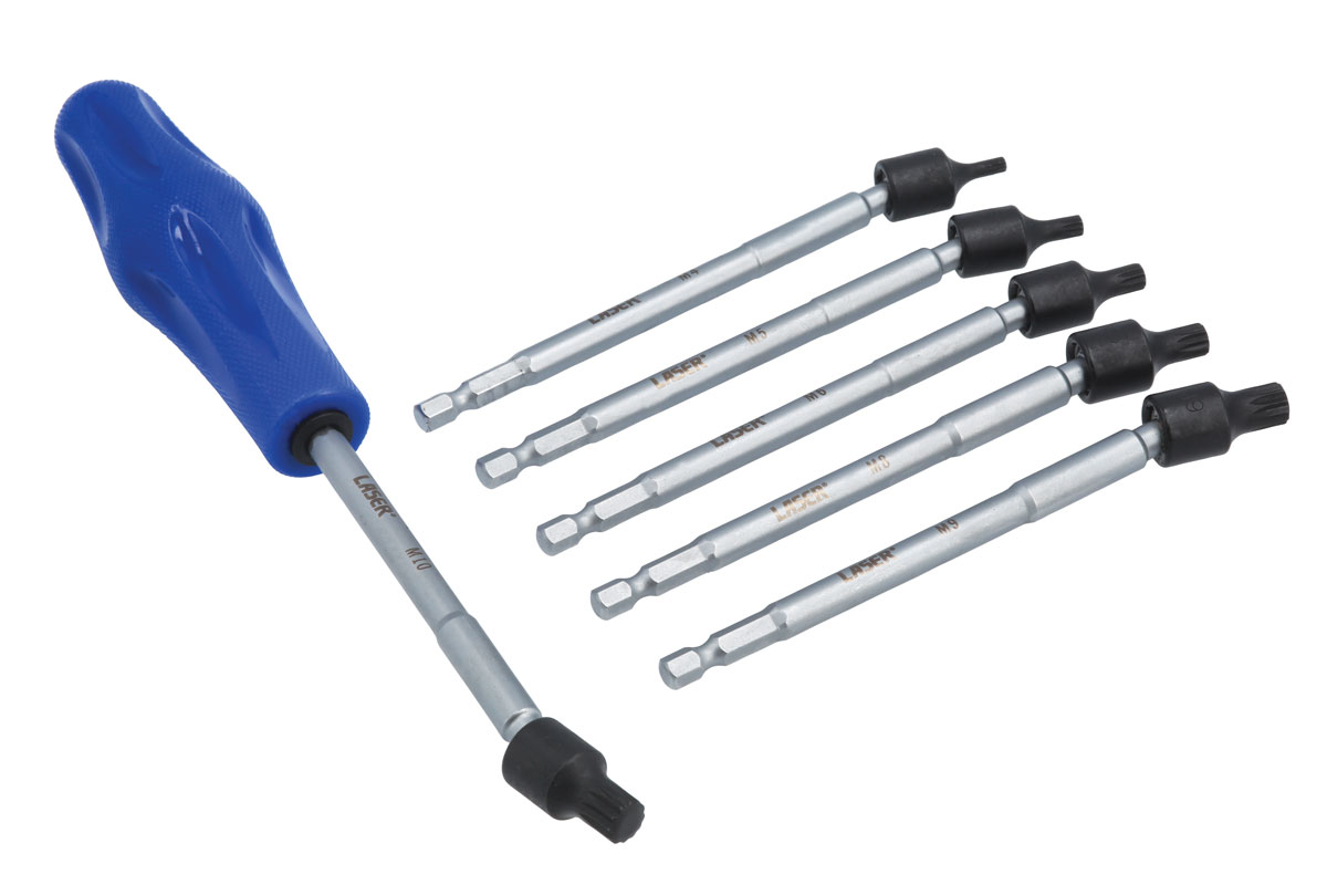 This set of 6 universal joint Spline bits are 148mm long and have a 15º working angle allowing them to be used to drive fixings in narrow or hard to reach places. They feature a quick chuck connection allowing for an easy fitment into the 2 way handle, that is both positive and secure, and come supplied in a EVA foam tray making them easy to keep organised.