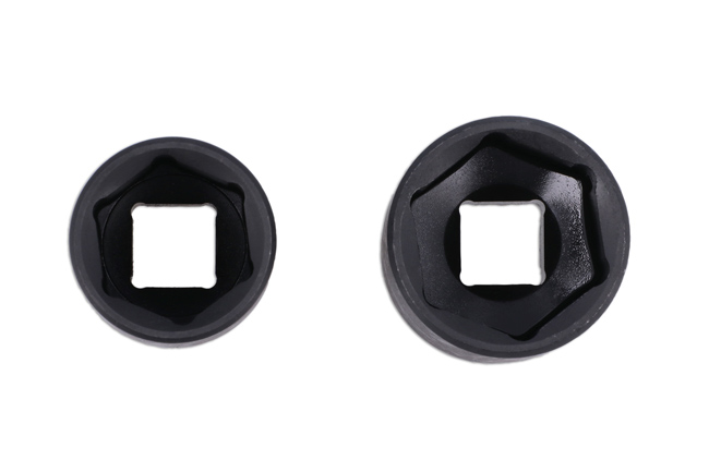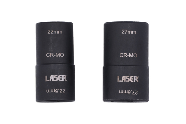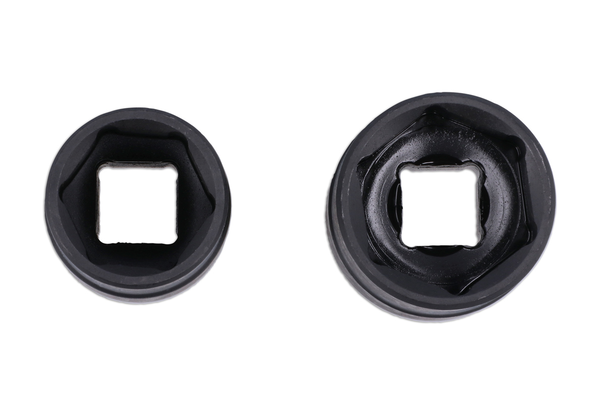 Some wheel nuts are manufactured with a permanently fitted chromium plated cap. These start off from the factory as a whole size, but over time due to the combination of corrosion and impact tool use, the wheel nuts can swell by up to 0.5mm. This set includes 2 double ended impact sockets for use on 22 and 27mm wheel nuts to overcome this issue.