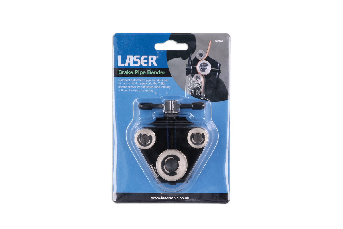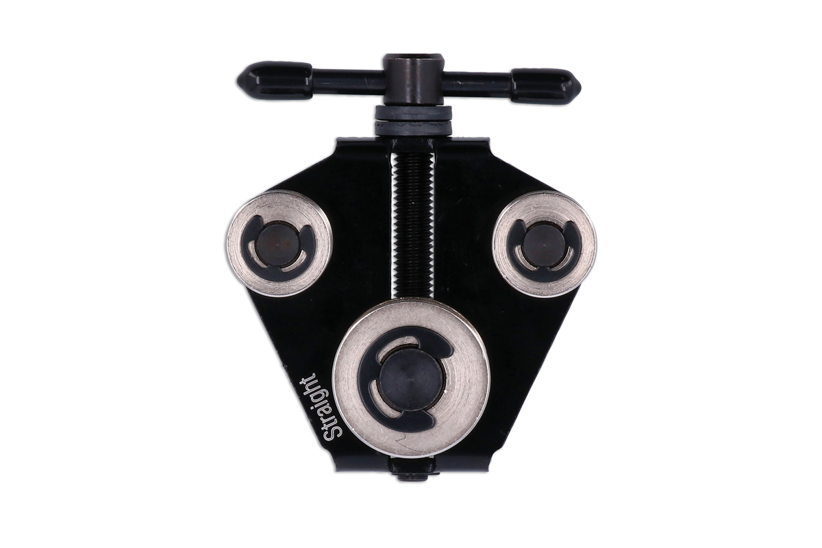 A specialist automotive pipe bender designed for brake pipework, featuring a triple roller design and T-Bar handle for controlled pipe forming without the risk of crushing. The compact, low profile design makes it ideal for on-vehicle use. A simple tool for quick bending of small diameter pipes up to 6.35mm across a range of materials, including copper and cupro-nickel.