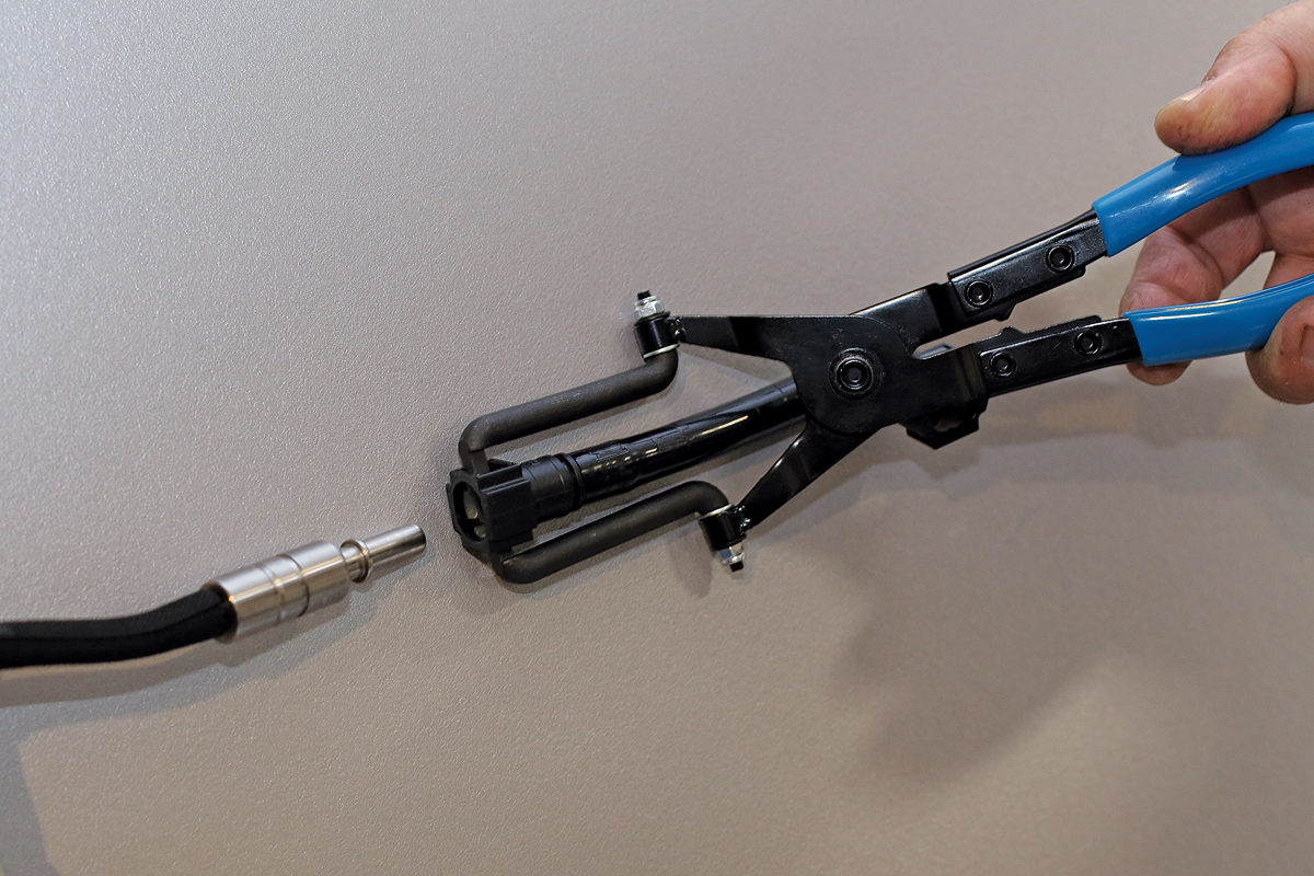 - Größere Länge und Schwenkbacken ermöglichen die Verwendung an schwer zugänglichen Kraftstoffleitungsanschlüssen.