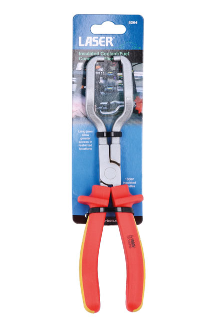 Multi-purpose coolant/fuel connector pliers with 1000V insulated handles, designed to release the connectors on battery coolant systems found on hybrid & electric vehicles. They can also be used for releasing connections on vehicle fuel lines during maintenance or when replacing fuel filters.