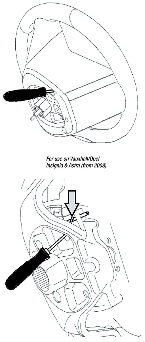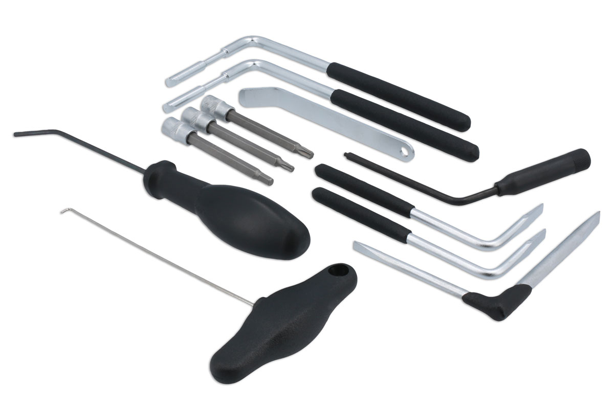Model covered include: BMW, Citroën, Fiat, Ford, Land Rover, Mercedes-Benz, Mitsubishi, Renault, Vauxhall & Volkswagen Group. The tool set includes: 1/4"D tamperproof Star* T25 socket bit (BMW) & Star* T30 socket bit (BMW, Mercedes-Benz, Vauxhall/Opel, Renault, VW Group), 1/4"D 5mm hex socket bit (VW Group), plus a selection of specially shaped levers for releasing airbag holding springs. The kit also includes a specially shaped spring hook for Land Rover (also available separately (part No. 7345) and Vauxhall/Opel Insignia and Astra from 2008 (part No. 6583). Included tools equivalent to OEM JC100, T10119, T10610, T40207, 501-106.