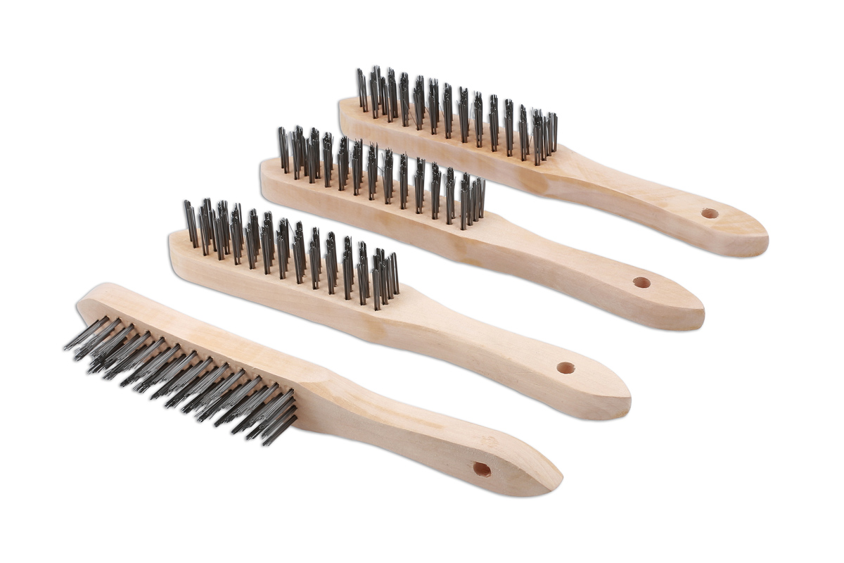 Set van 4 draadborstels voor algemeen gebruik geschikt voor een groot aantal toepassingen, waaronder verwijdering van roest en corrosie en het verwijderen van loszittende verf en vuil voor het lassen of aansluiten van elektrische componenten. Ze worden geleverd met een zware houten handgreep, met een gat voor ophaning, en vier rijen stalen borstelharen van ongeveer 22mm lang. Ideaal voor gebruik in de werkplaats of thuis. Ook geschikt voor het schoonmaken van terrassen en barbecues.
