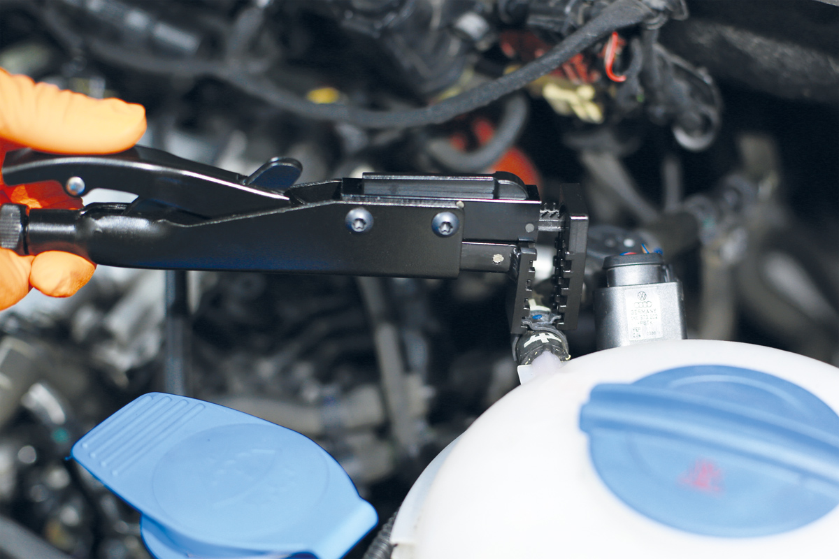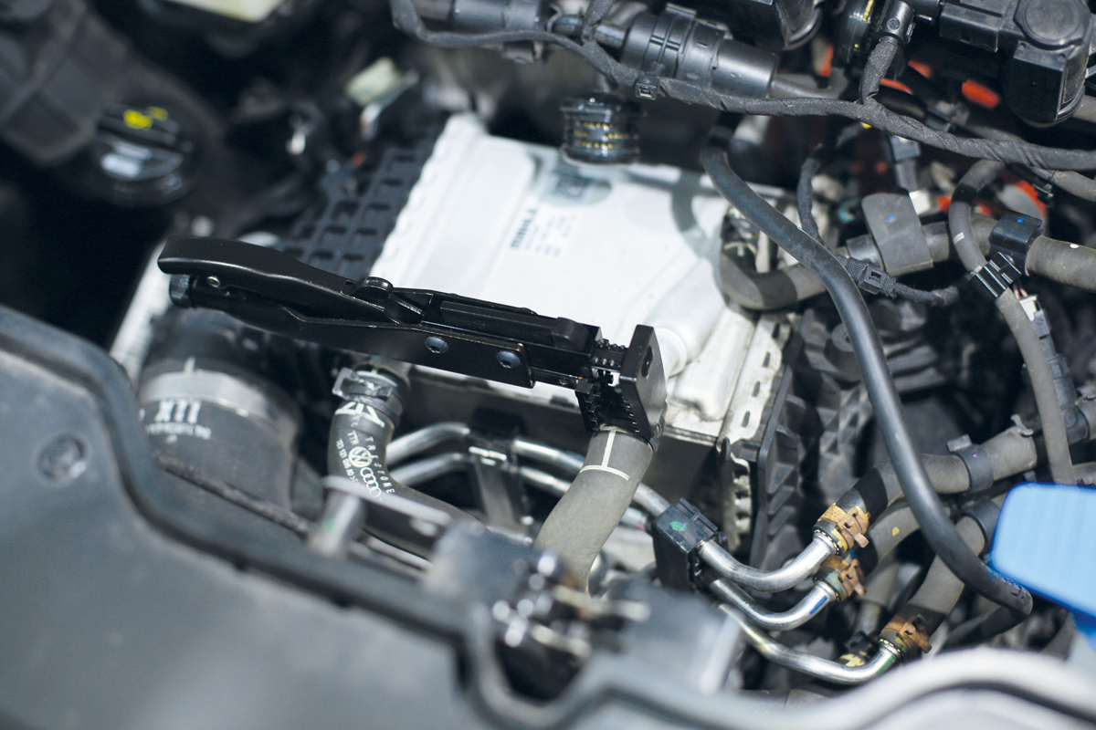 Tang voor het verwijderen van slangklemmen, zowel ringvormig als vlak met veer, en clips. Met waffelvorm voor meer grip, en een axiaal vergrendelbaar handvat dat de slangklem veilig open houdt en tegelijk goede toegang geeft, ook als hij bekneld zit tussen andere onderdelen in de motorruimte. De bek laat zich gemakkelijk afstellen met een snelknop bovenop de tang. De maximale opening van de bek is 65mm.