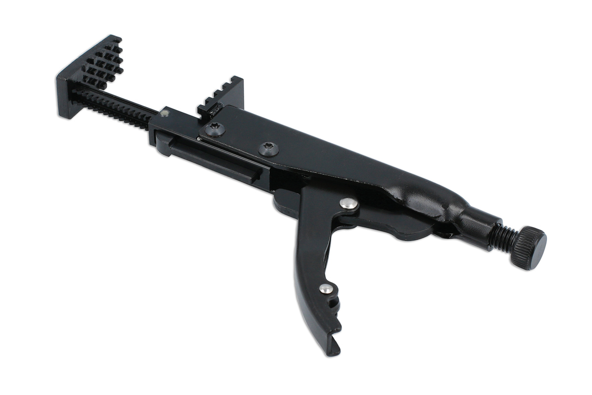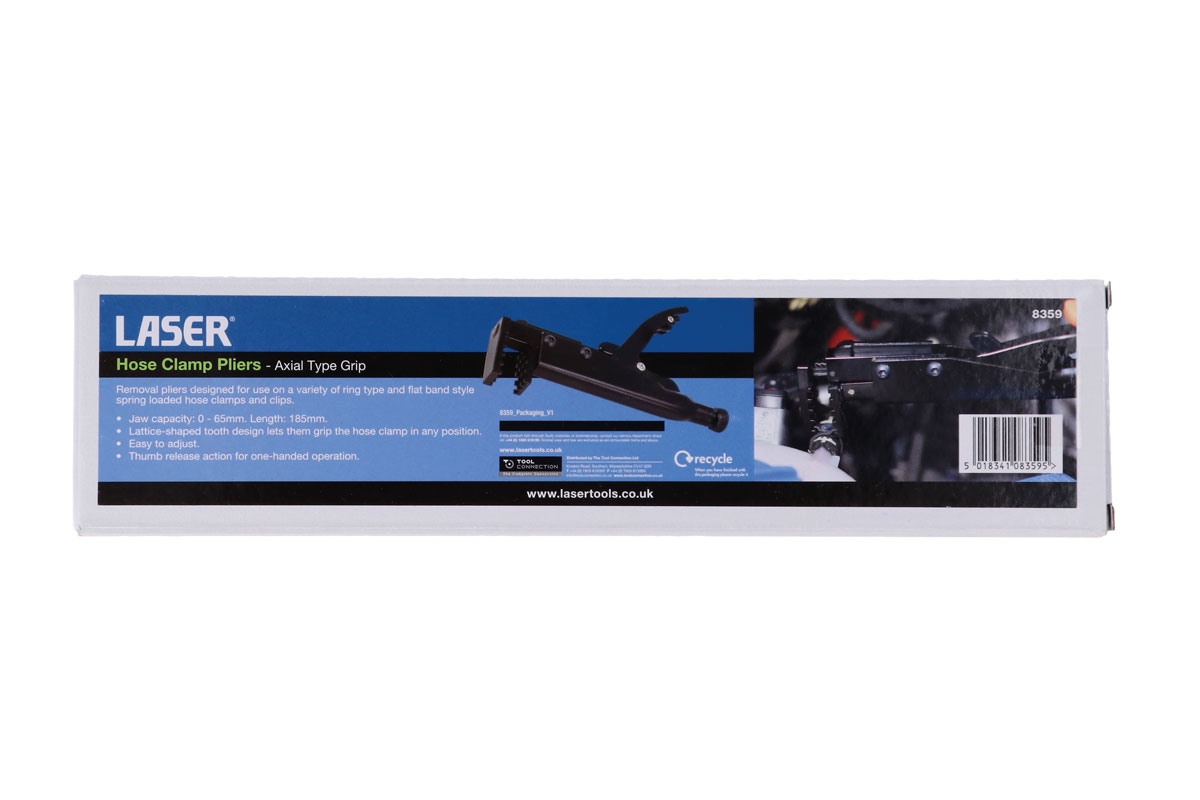Hose clamp removal pliers for use on ring type and flat band style spring loaded hose clamps and clips. Featuring a waffle design for improved grip, together with an axial type locking grip that allows for easy access to the hose clamp opening between tightly packed components in the engine bay whilst securely clamping it in the open position. The jaws are easy to adjust, through the use of a quick release button on the top of the pliers, and have a maximum opening of 65mm.