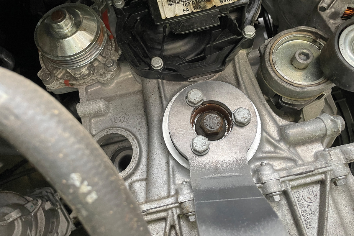 - Designed to bolt on in place of the crankshaft front pulley and allow the user to hold the crankshaft while loosening and tightening the central camshaft bolt.