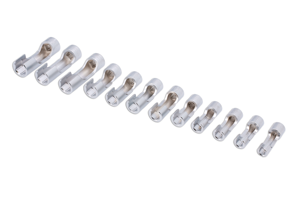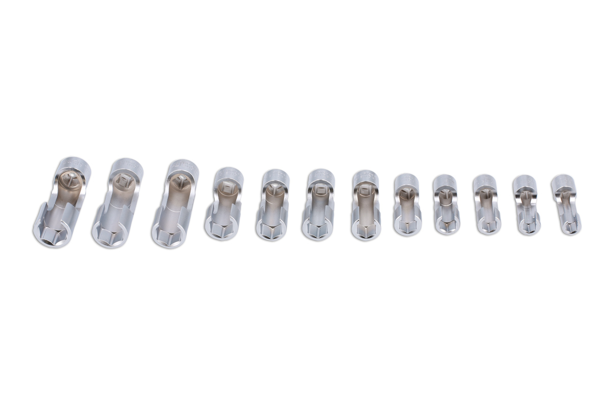 Jeu de douze douilles pour accès difficile à carré de 3/8", dans une plage de tailles utiles allant de 8 à 19 mm. Ces douilles longues comportent une section découpée pour permettre l'accès aux raccords de tuyaux et aux unités de capteurs câblés et sont particulièrement utiles pour le desserrage des tuyaux ABS, des tuyaux de maître-cylindre, des conduites d'injection diesel et des capteurs câblés. Jeu de qualité professionnelle en chrome vanadium à finition satinée et fourni dans un étui robuste moulé par soufflage.