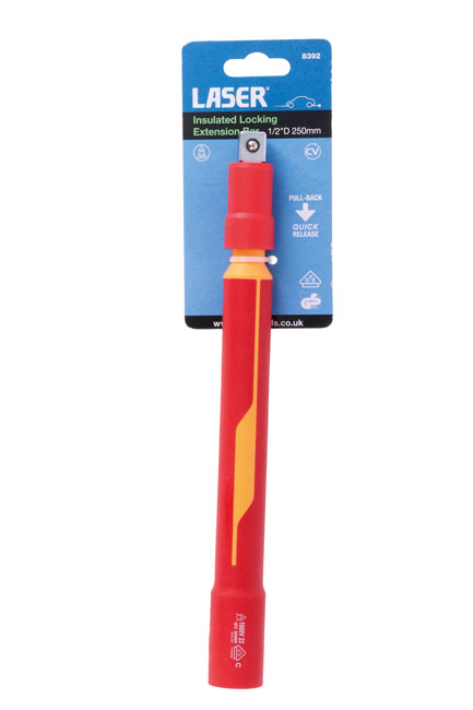 A 250mm insulated 1/2"D extension bar featuring a socket locking mechanism with a fully insulated pull-back quick release collar, designed to protect up to 1000V for use on hybrid and electric vehicles. VDE certified.