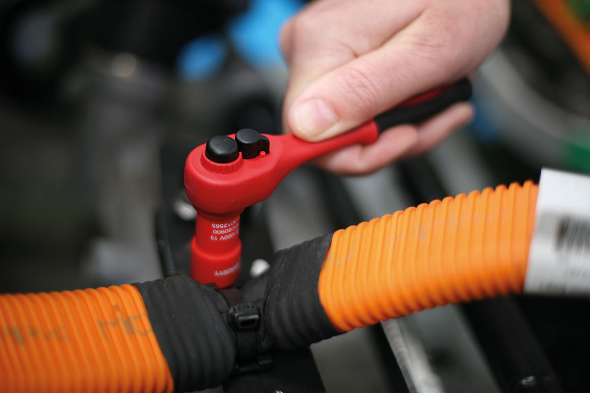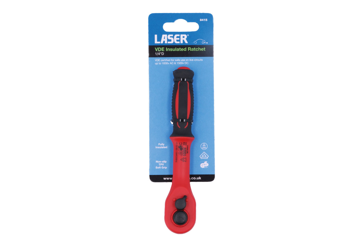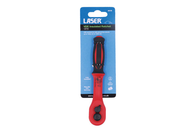 A fully insulated 1/4"D ratchet with a reversible 45 tooth mechanism, push button quick release and a comfort grip handle. VDE certified for safe operator use on live circuits up to 1000v AC and 1500v DC. Suitable for use by technicians and mechanics working on hybrid and electric vehicles, together with professional electricians and installers.