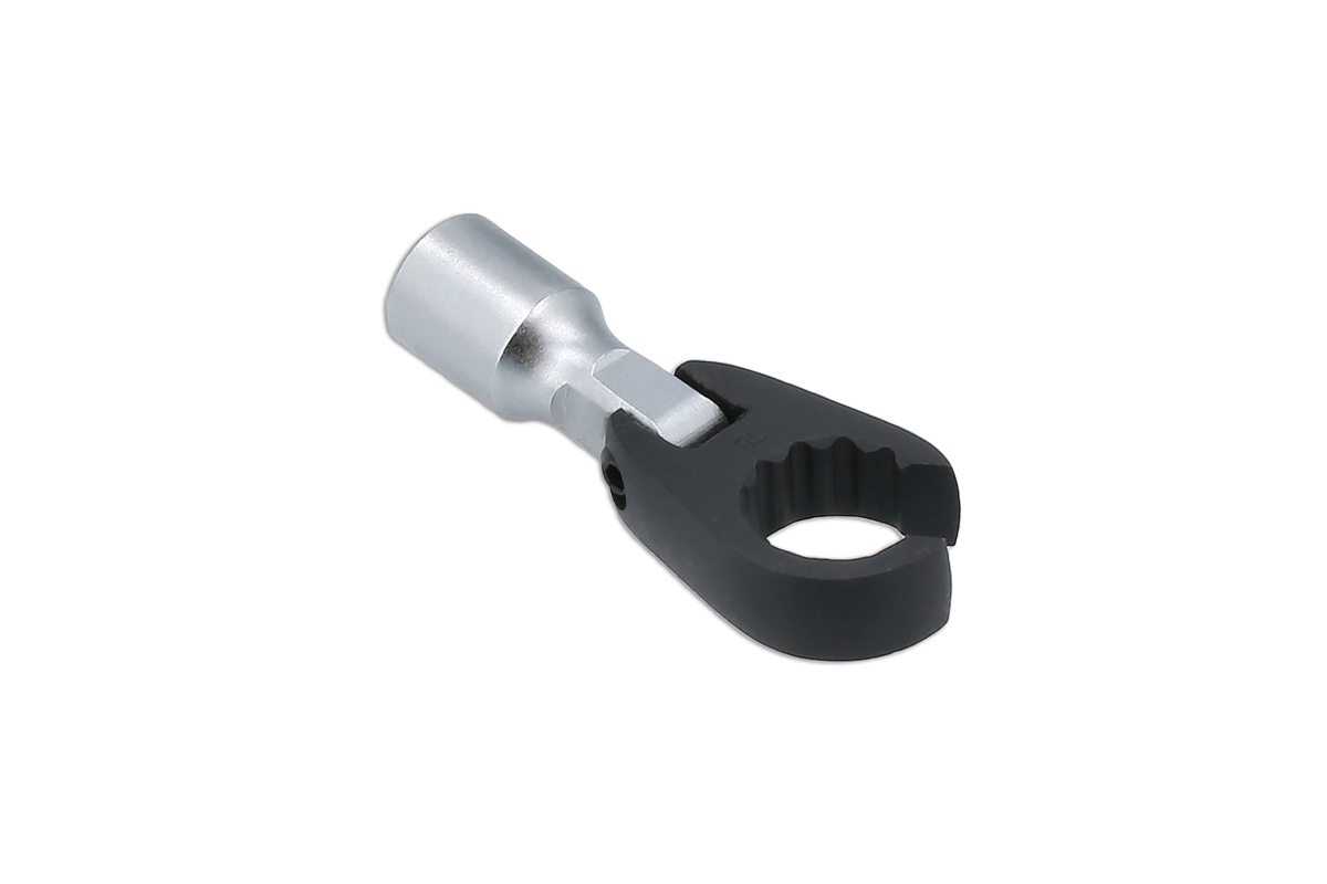 Flexibler 18-mm-Hahnenfußschlüssel zur Verwendung mit einer Ratsche mit 3/8"-Antrieb. Durch den flexiblen Kopf ist er ideal für den Einsatz an schwer zugänglichen Stellen. Das offene Ende ermöglicht die Verwendung an Überwurfmuttern oder Sensoren.