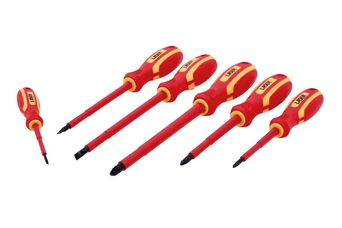 - Een set volledig geïsoleerde VDE-gecertificeerde schroevendraaiers geschikt voor gebruik op circuits onder spanning tot 1000 V wisselstroom en 1500 V gelijkstroom, waardoor ze ideaal zijn voor gebruik door elektriciens, auto-elektriciens of monteurs die werken aan hybride en elektrische voertuigen. Gemaakt van chroom-vanadium voor sterkte, met softgrip handgrepen voor comfort.