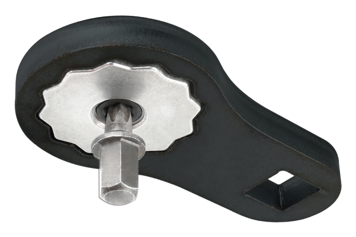 Ein zweiteiliger Satz gekröpfter Kugelgelenkschlüssel für den Aus- und Einbau der oberen und unteren Kugelgelenkmuttern bei Mercedes-Modellen mit Doppelquerlenker-Aufhängung ab Baujahr 2015. Jeder der Schlüssel verfügt über einen Doppelsechskant-Hahnenfußring zur Fixierung des Kugelgelenkstifts.