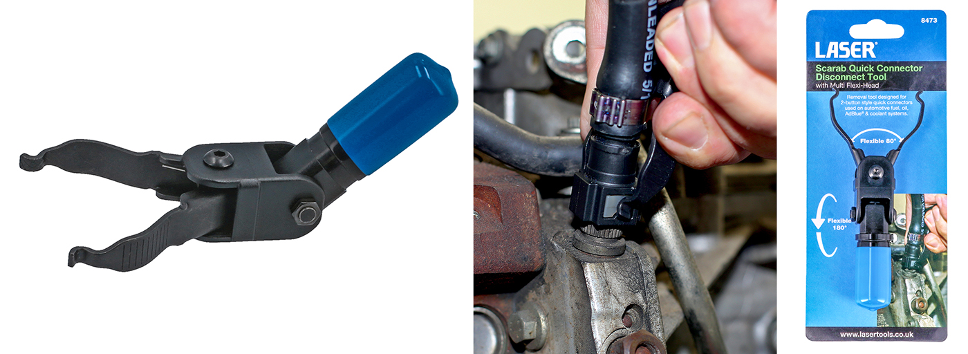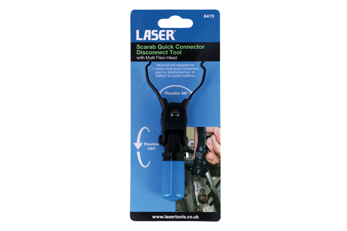 Removal tool designed for 2 button style quick connectors used on automotive fuel, oil, AdBlue® and coolant systems. The compact handle features a sand dipped textured finish for improved grip, together with a flexible head that allows for the spring-loaded scarab type jaws to be used one-handed and provide easy access to the quick connector buttons in tight spaces.