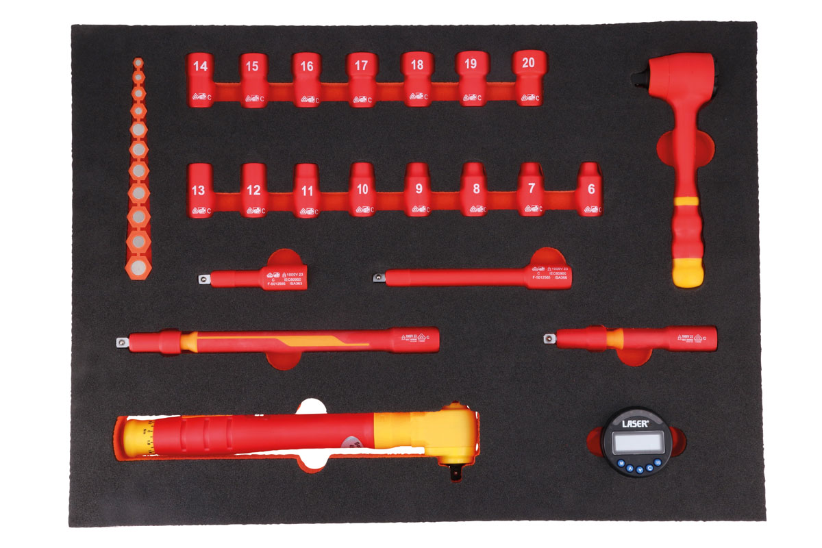 A fully insulated socket set, including torque wrench and a digital magnetic angle gauge, specifically selected for working on EV’s and Hybrid vehicles. Each tool is fully insulated to VDE/GS and IEC60900 standards, approved for work up to 1000V AC or 1500V DC. The foam tray is made from high density PU foam, with contrasting colour cut-outs for each tool, to make for easy control of tool contents. Tray dimensions 563 x 409 x 37mm to suit most standard designs of tool cabinet, including Laser Part Nos. 5083 and 8248.