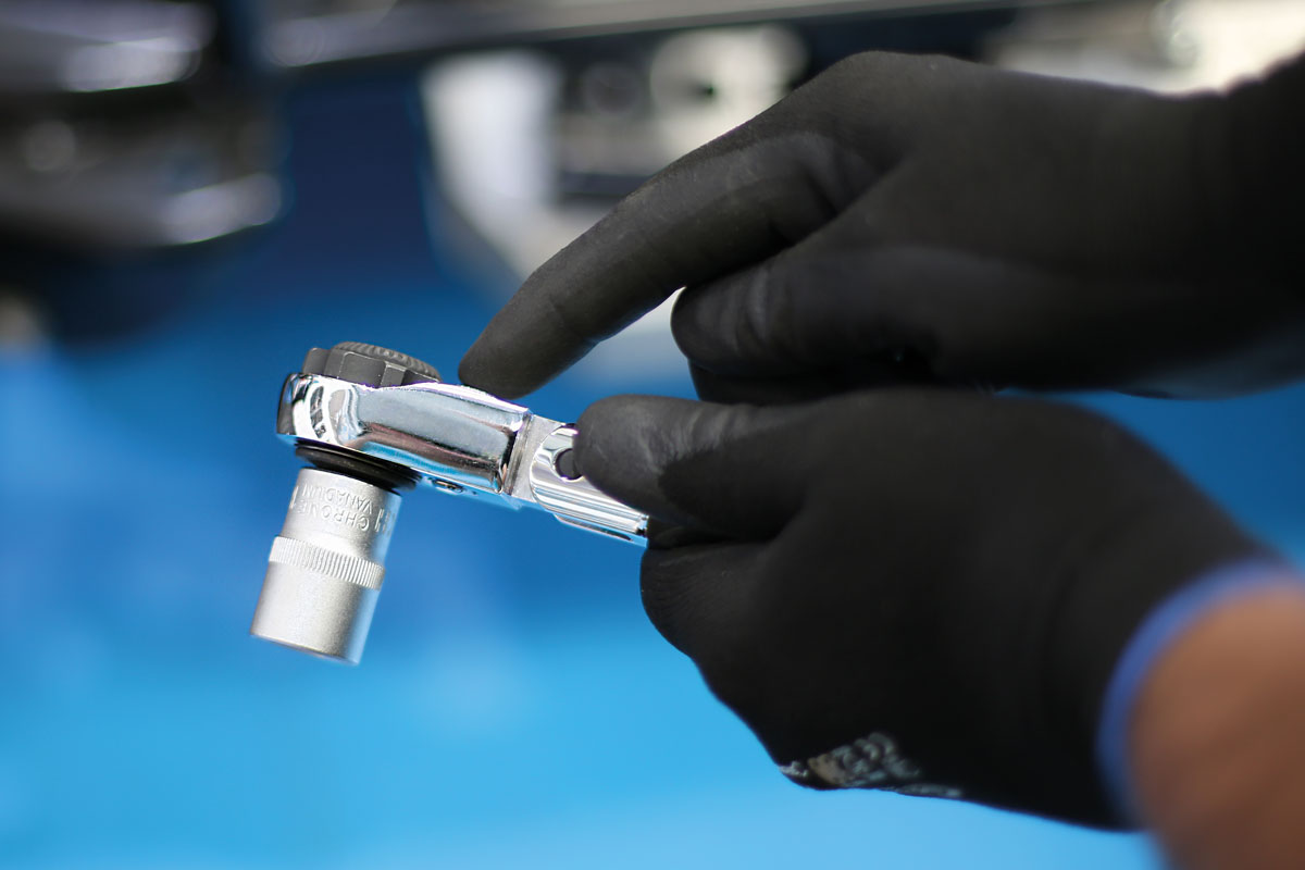- Ratsche mit Flexi-Kopf und Sperrknopf für höheres Drehmoment bei Verwendung als Verlängerung.