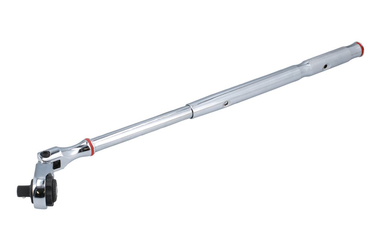 Een uitschuifbare ratel 1/2" met een scharnierende kop en ontkoppelknop, dit laat een groter koppel toe wanneer men een vaste dop wil verwijderen zonder het ratelmechanisme te beschadigen. De handgreep heeft twee vaste posities : 455mm en 630mm en dit samen met de scharnierende kop met 72 tanden maakt hem ideaal voor moeilijk bereikbare bouten en moeren.