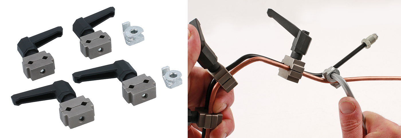 A pair of brake pipe bender tools for shaping both copper and cupro-nickel brake pipes in-situ on the vehicle, and are designed to be used with a standard 6mm hex key or a 1/4"D ratchet (not included). The set also includes two pairs of brake pipe clamps to enable the new pipe to be held next to the existing pipe, while still attached to the car, so that the replacement can be shaped to replicate the one that it’s replacing.