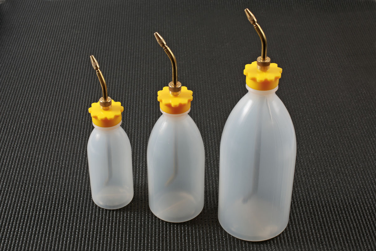 A soft plastic oiler with an angled nozzle that can be adjusted to reach hard to access lubrication points or so that it can be used when inverted. The nozzle end cap can also be adjusted to alter the speed of the fluid being dispensed as well enabling it to be closed to prevent it leaking when it’s not in use.