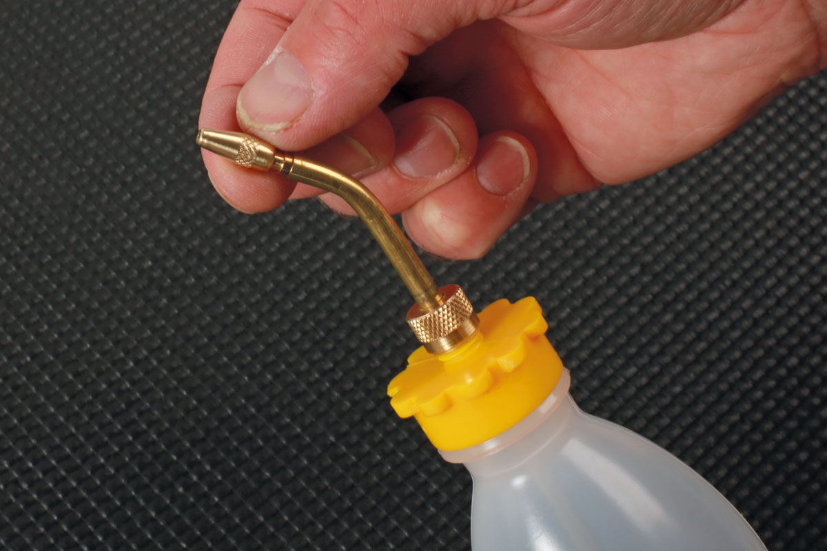 Öler aus Weichkunststoff mit abgewinkelter Düse, die so eingestellt werden kann, dass schwer zugängliche Schmierstellen erreicht werden können oder sodass der Öler kopfüber verwendet werden kann. Die Endkappe der Düse kann ebenfalls eingestellt werden, um die Austrittsgeschwindigkeit der Flüssigkeit zu verändern, und sie kann geschlossen werden, um bei Nichtgebrauch ein Auslaufen zu verhindern.