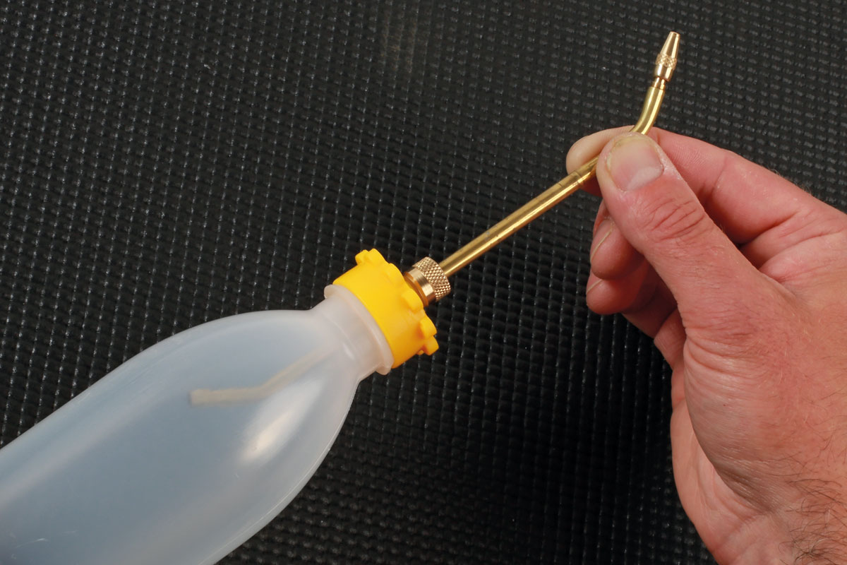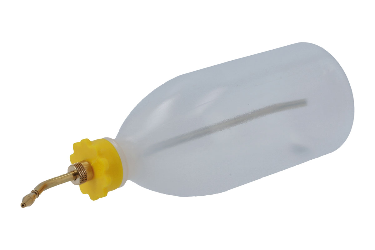 Een zacht kunststoffen oliespuit met gebogen sproeistuk dat kan geregeld worden om moeilijke smeerpunten te bereiken. Het sproeistuk kan geregeld worden om de hoeveeldheid olie te regelen en het eventueel te sluiten.