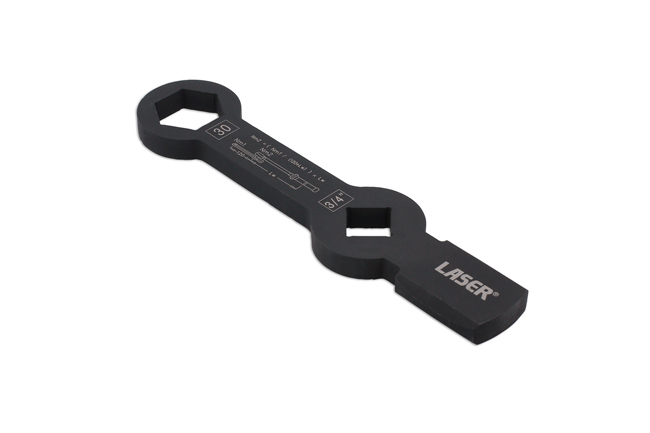 Bremssattelschlüssel mit 3/4"-Antrieb zum Lösen und Wiedereinbau von Bremssattel-Befestigungsschrauben an Nutzfahrzeugen. Diese Bremssattel-Befestigungsschrauben werden mit sehr hohen Drehmomenten angezogen. Dieser Schraubenschlüssel mit 3/4"-Antrieb und zwei Schlagflächen ist so konzipiert, dass er die Schrauben lösen kann.
